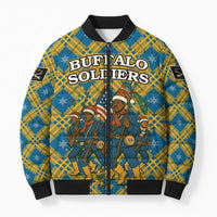 Grab your Buffalo Soldiers Christmas Bomber Puffer Jacket with Blue Yellow Plaid Parade Illustration Design by Wonder Print Shop today and experience comfort, style, and versatility in one sleek jacket.
