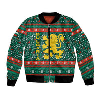 Bulgaria Christmas Bomber Jacket with Green-Red Theme, Golden Lion, and Santa Sleigh Motif