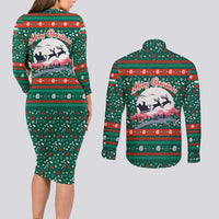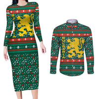 Bulgaria Christmas Couples Matching Long Sleeve Bodycon Dress and Long Sleeve Button Shirt with Green-Red Theme, Golden Lion, and Santa Sleigh Motif TS04