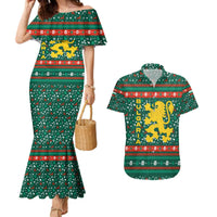 Bulgaria Christmas Couples Matching Mermaid Dress and Hawaiian Shirt with Green-Red Theme, Golden Lion, and Santa Sleigh Motif
