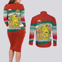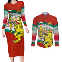 Bulgaria Lion Couples Matching Long Sleeve Bodycon Dress and Long Sleeve Button Shirt Tricolor Flag, Folk Pattern and Proud Motto
