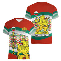 Bulgaria Lion Women V-Neck T-Shirt Tricolor Flag, Folk Pattern and Proud Motto