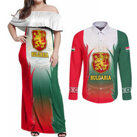 Bulgaria National Crest Couples Matching Off Shoulder Maxi Dress and Long Sleeve Button Shirt with Tricolor Design and Folk Cuff Pattern