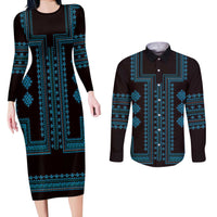 Bulgaria Traditional Pattern Blue Couples Matching Long Sleeve Bodycon Dress and Long Sleeve Button Shirt Balkan Culture