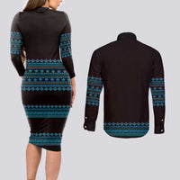 Bulgaria Traditional Pattern Blue Couples Matching Long Sleeve Bodycon Dress and Long Sleeve Button Shirt Balkan Culture LT01