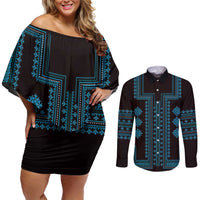 Bulgaria Traditional Pattern Blue Couples Matching Off Shoulder Short Dress and Long Sleeve Button Shirt Balkan Culture LT01