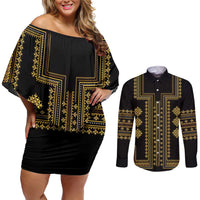 Bulgaria Traditional Pattern Gold Couples Matching Off Shoulder Short Dress and Long Sleeve Button Shirt Balkan Culture LT01