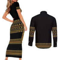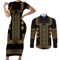 Bulgaria Traditional Pattern Gold Couples Matching Short Sleeve Bodycon Dress and Long Sleeve Button Shirt Balkan Culture