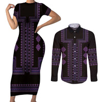 Bulgaria Traditional Pattern Purple Couples Matching Short Sleeve Bodycon Dress and Long Sleeve Button Shirt Balkan Culture