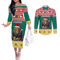 Cameroon Christmas Couples Matching Off The Shoulder Long Sleeve Dress and Long Sleeve Button Shirt Lion Santa Joyeux Noel