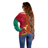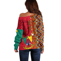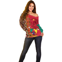 Cameroon National Day Off Shoulder Sweater Cameroun Coat Of Arms Ankara Pattern LT01
