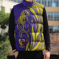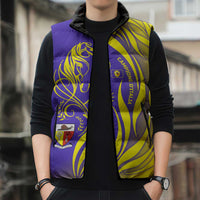 Get your Campione d’Italia Sleeveless Puffer Jacket with Yellow Horse Graphic and Purple Flame Crest by Wonder Print Shop today and experience warmth, style, and versatility in one perfect piece.