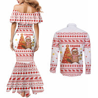 Canada Christmas Couples Matching Mermaid Dress and Long Sleeve Button Shirt with Beaver Maple Tree Ice Wine Pie and Red White Knit Pattern Design