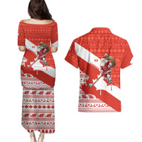 Canada Christmas Couples Matching Puletasi and Hawaiian Shirt with Santa Playing Hockey Maple Leaf Flag and Red White Knit Pattern Design