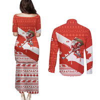 Canada Christmas Couples Matching Puletasi and Long Sleeve Button Shirt with Santa Playing Hockey Maple Leaf Flag and Red White Knit Pattern Design
