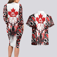 Canada Day Couples Matching Long Sleeve Bodycon Dress and Hawaiian Shirt The Forest Moose and Maple Leaves-Haida Pattern LT03