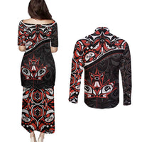 Canada Day Couples Matching Puletasi and Long Sleeve Button Shirt Haida Maple Leaf Style Tattoo Black