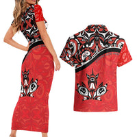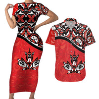 Canada Day Couples Matching Short Sleeve Bodycon Dress and Hawaiian Shirt Haida Maple Leaf Style Tattoo Red