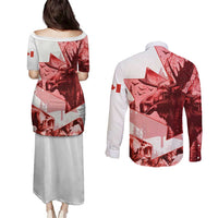Canada Flag Couples Matching Puletasi and Long Sleeve Button Shirt Caribou Design with National Symbol