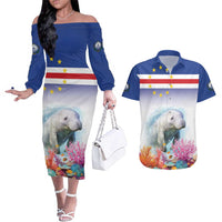 Cape Verde Manatee Couples Matching Off The Shoulder Long Sleeve Dress and Hawaiian Shirt Coral Reef With Flag Style