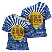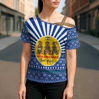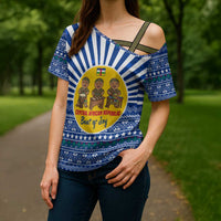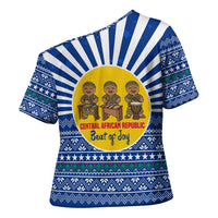 Turn heads and express your unique style with the Central African Republic Christmas Cross Shoulder Shirt with Drumming Kids Beat of Joy Tribal Pattern and Snowflakes from Wonder Print Shop. Perfect for casual outings, festivals, or making a fashion statement, this custom-made cross shoulder shirt combines high-end craftsmanship with eye-catching design.