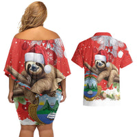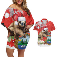 Christmas Costa Rica Couples Matching Off Shoulder Short Dress and Hawaiian Shirt A Cheerful Sloth Wearing a Santa Hat