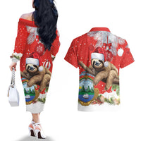 Christmas Costa Rica Couples Matching Off The Shoulder Long Sleeve Dress and Hawaiian Shirt A Cheerful Sloth Wearing a Santa Hat