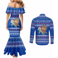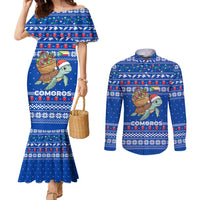 Comoros Christmas Couples Matching Mermaid Dress and Long Sleeve Button Shirt with Santa Turtle Gifts Snowflakes and Ocean Blue Holiday Pattern
