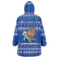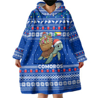 Comoros Christmas Wearable Blanket Hoodie with Santa Turtle Gifts Snowflakes and Ocean Blue Holiday Pattern