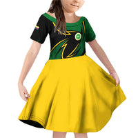 Comoros Family Matching Off Shoulder Short Dress and Hawaiian Shirt with Green Black Yellow Swirl Design and National Emblem Pattern