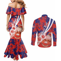 Costa Rica Couples Matching Mermaid Dress and Long Sleeve Button Shirt Coat of Arms Hibiscus Pattern