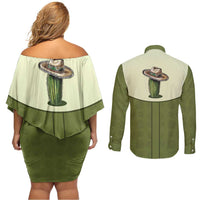 Cowboy Couples Matching Off Shoulder Short Dress and Long Sleeve Button Shirt Cactus Retro Western Yoke