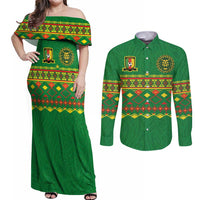 Custom Cameroon Football Couples Matching Off Shoulder Maxi Dress and Long Sleeve Button Shirt Tribal Motifs Green Color