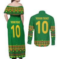 Custom Cameroon Football Couples Matching Off Shoulder Maxi Dress and Long Sleeve Button Shirt Tribal Motifs Green Color LT03