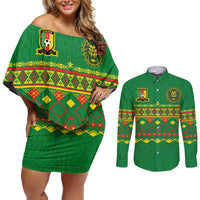 Custom Cameroon Football Couples Matching Off Shoulder Short Dress and Long Sleeve Button Shirt Tribal Motifs Green Color