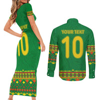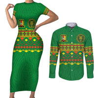 Custom Cameroon Football Couples Matching Short Sleeve Bodycon Dress and Long Sleeve Button Shirt Tribal Motifs Green Color