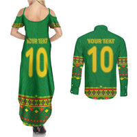 Custom Cameroon Football Couples Matching Summer Maxi Dress and Long Sleeve Button Shirt Tribal Motifs Green Color LT03