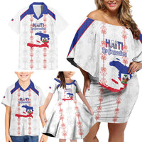 Custom Haiti Football Family Matching Off Shoulder Short Dress and Hawaiian Shirt Les Grenadiers Veve Vodou White