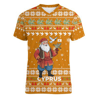 Cyprus Christmas Women V-Neck T-Shirt with Santa Holding Doves Olive Branch Snowflakes and Holiday