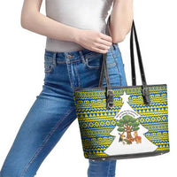 Ecuador Christmas Leather Tote Bag with Ceibo Tree Llama Toucan and Traditional Yellow Blue Pattern Design