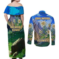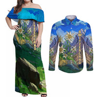 Edelweiss Flower Switzerland Mountain Couples Matching Off Shoulder Maxi Dress and Long Sleeve Button Shirt