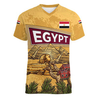 Egyptian Pyramids and Anubis Women V-Neck T-Shirt with Camel Caravan Desert