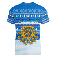 Estonia Christmas Women V-Neck T-Shirt with Santa Otters Lights Snowflakes and National Emblem on Blue Pattern