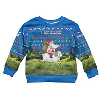 Faroe Islands Christmas Kid Ugly Christmas Sweater with Santa Riding Sheep Grass Roof Houses and Blue Nordic Pattern Design TS04