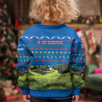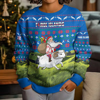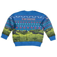 Faroe Islands Christmas Kid Ugly Christmas Sweater with Santa Riding Sheep Grass Roof Houses and Blue Nordic Pattern Design
