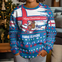 Faroe Islands Christmas Kid Ugly Christmas Sweater with Santa Riding Whale Faroe Flag and Blue Nordic Winter Pattern Design TS04