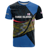 Faroe Islands T Shirt with Waterfall Nature Scene and Rune Pattern Design