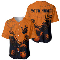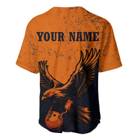 Flying Eagle Carrying Bowling Ball Baseball Jersey with Grunge Orange and Black Splatter Design
