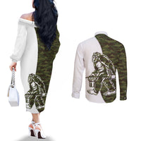 Funny Bigfoot Green Military Texture Fish Couples Matching Off The Shoulder Long Sleeve Dress and Long Sleeve Button Shirt