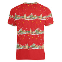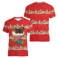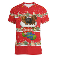 Funny Dachshund Dog Light Up Christmas Women V-Neck T-Shirt Snowy Village Red Holiday Design TS04